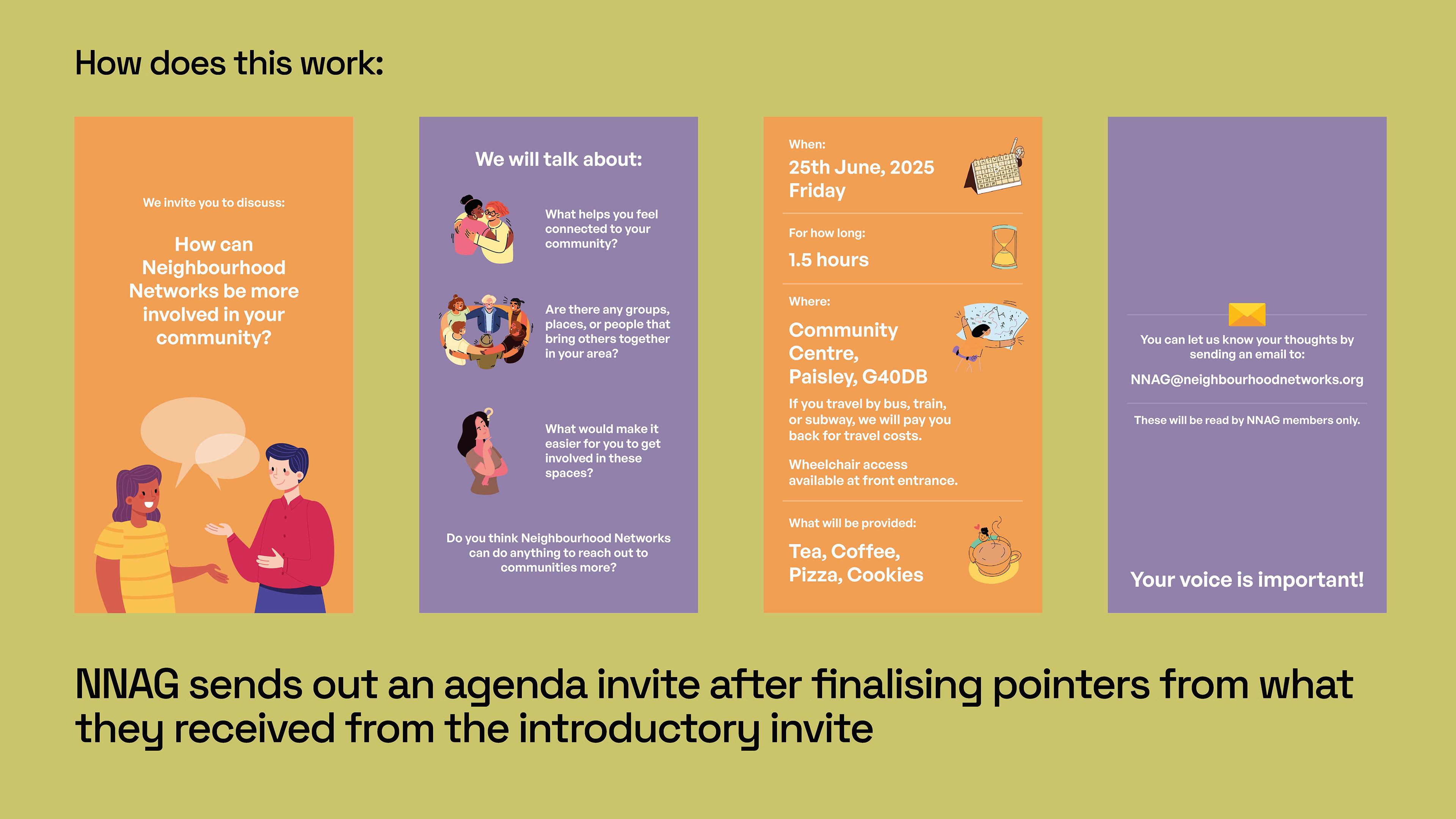 Digital invites sent to all members before NNAG meetings, outlining what will be discussed and welcoming them to attend.
