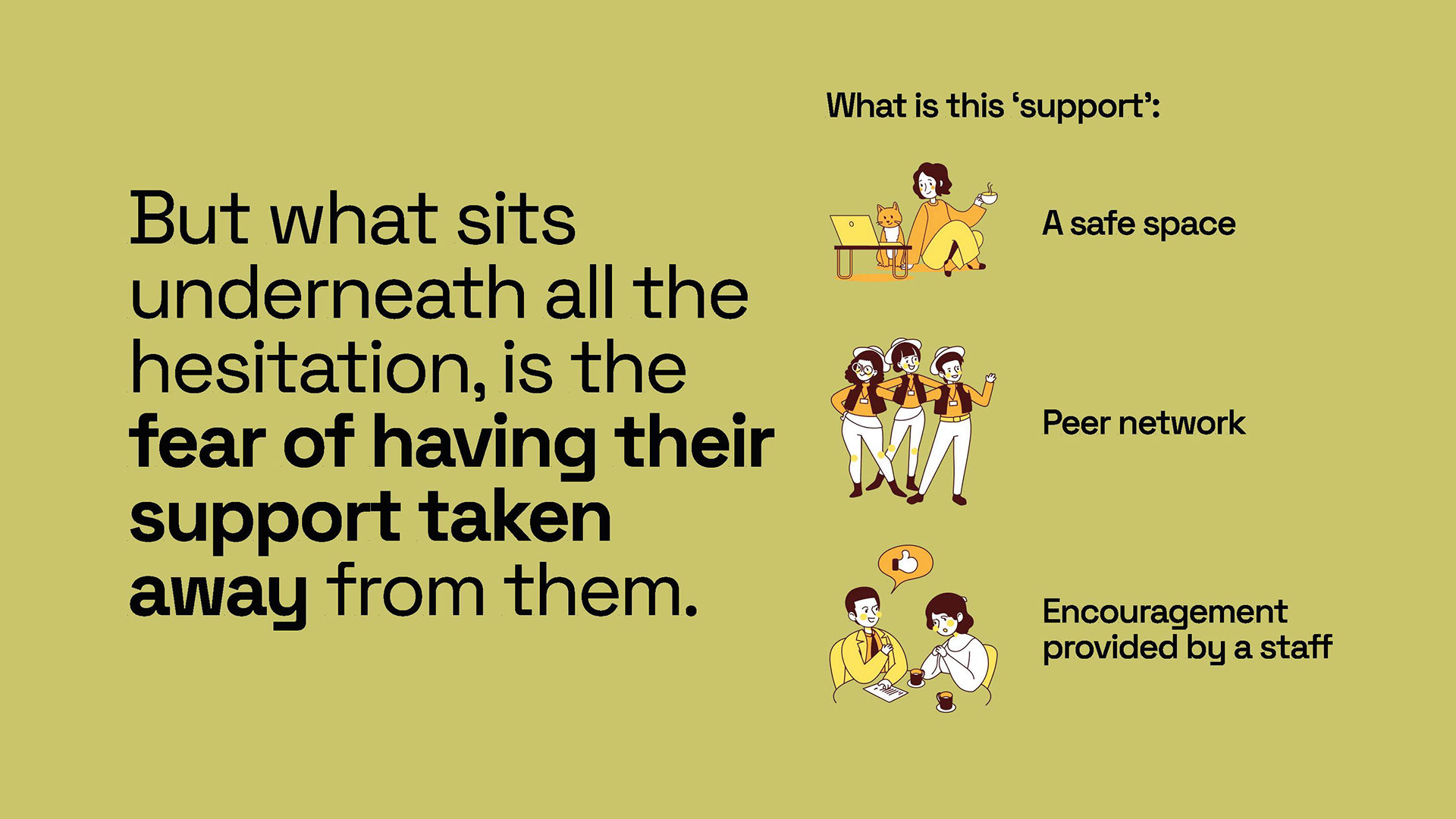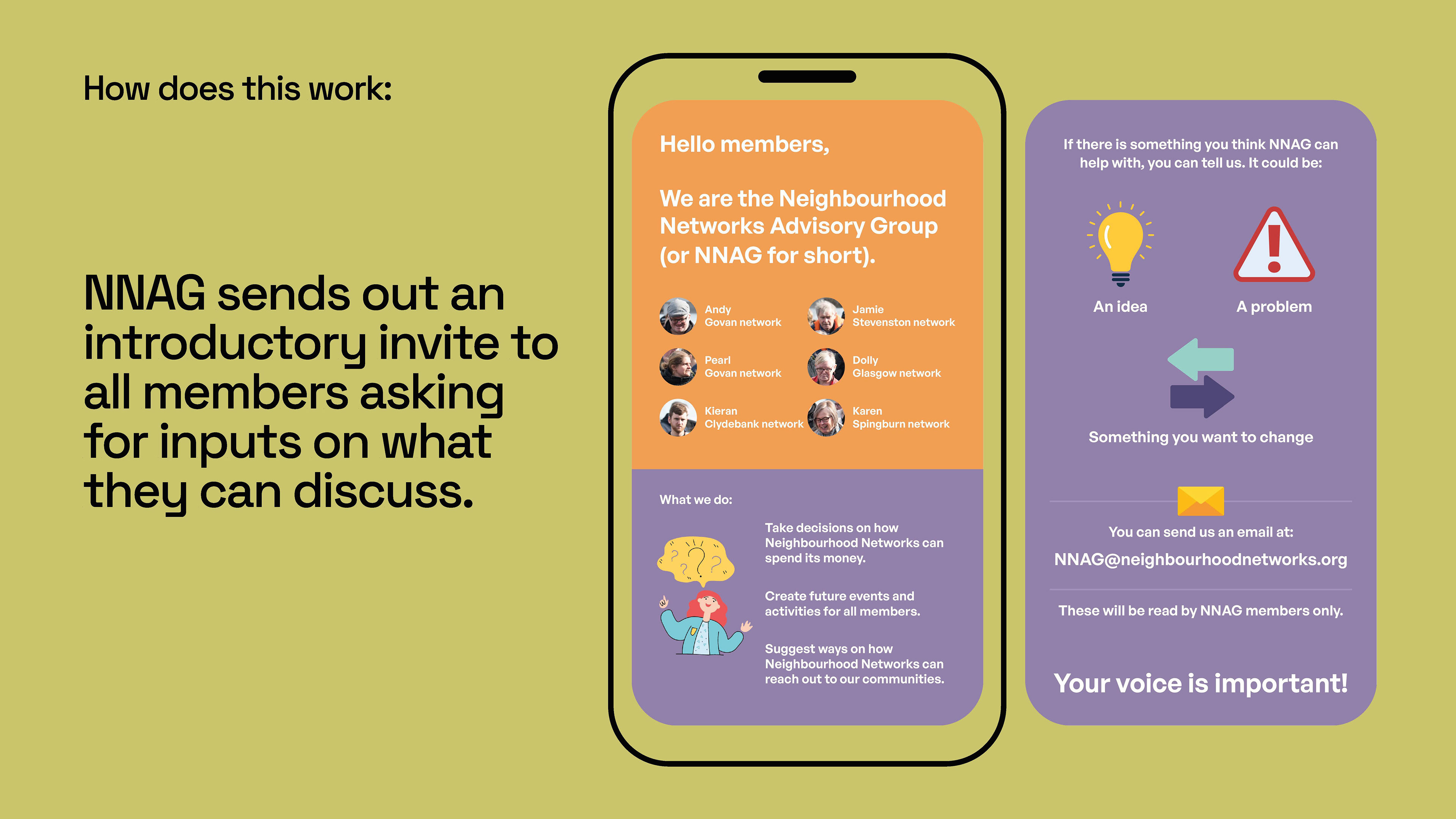 The proposed service shifted the advisory group's aim from focusing on member feedback to becoming truly member-led. This keeps the organisation relevant, meaningful, and attractive to funders. It also means decentralising communication so members connect directly with one another, supported by more visual, audio, and video information. We recognised many of Neighbourhood Networks' members needed more support to become involved with the advisory group, while others were not able to commit to being part of the group, staying in the loop through regular communication from the advisory group was important to them.