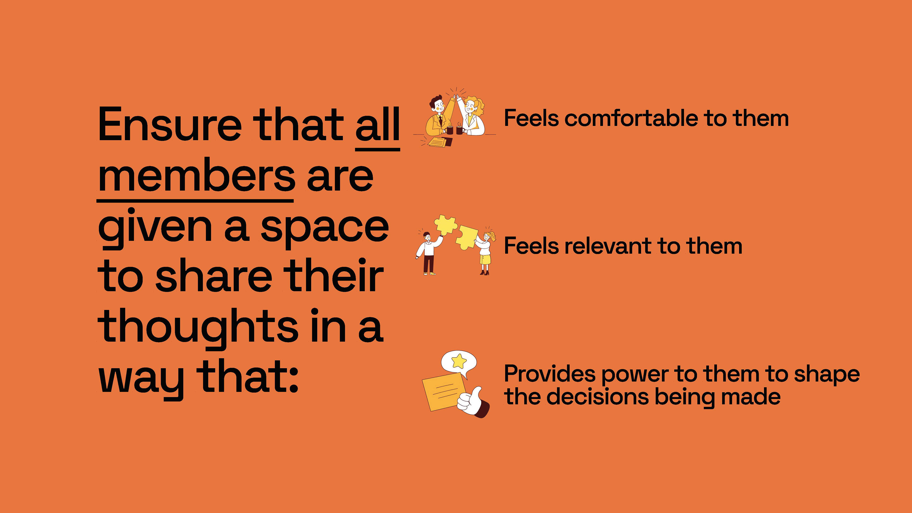 An external facilitator to run meetings, held in informal community spaces rather than staff offices.