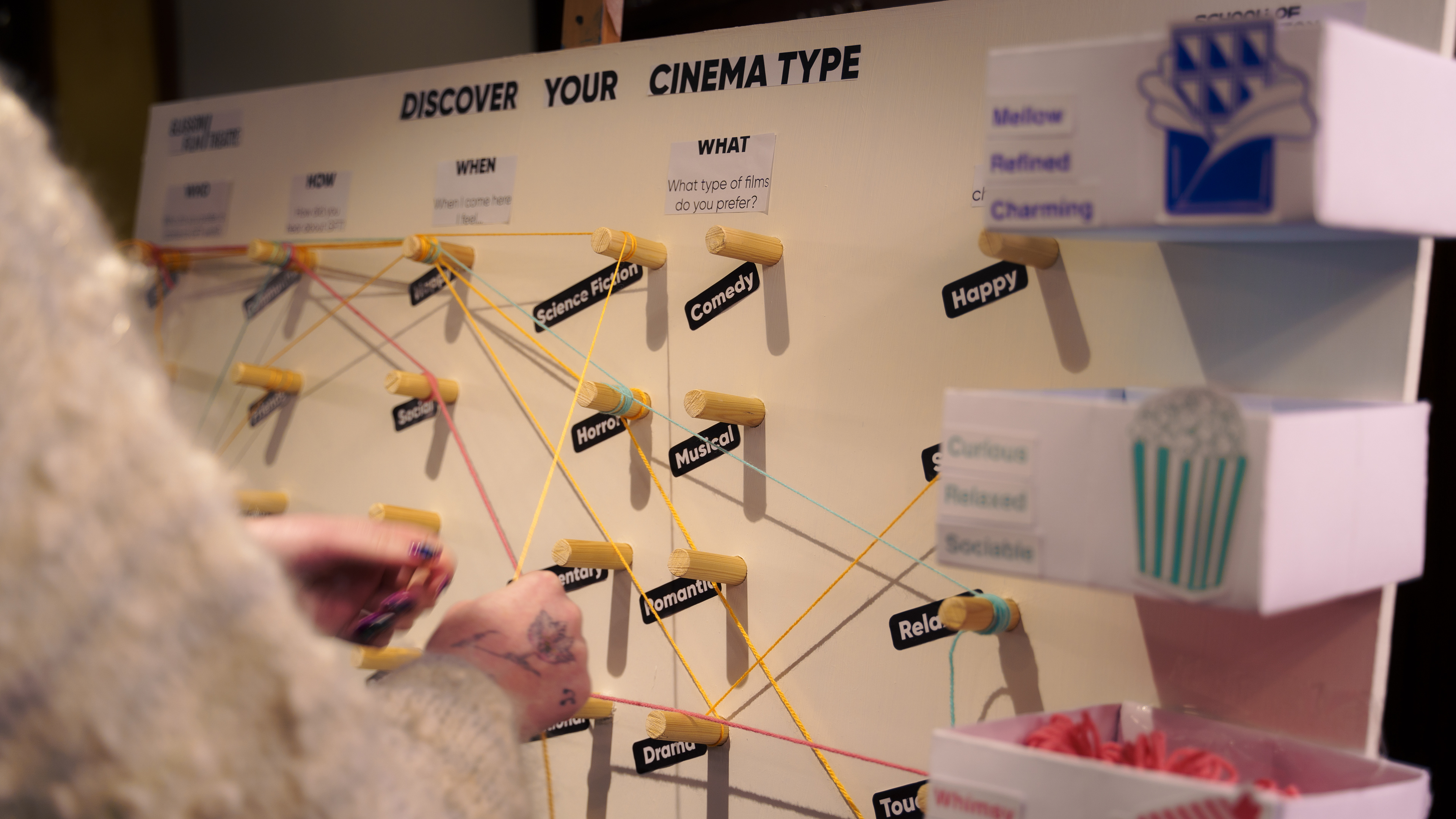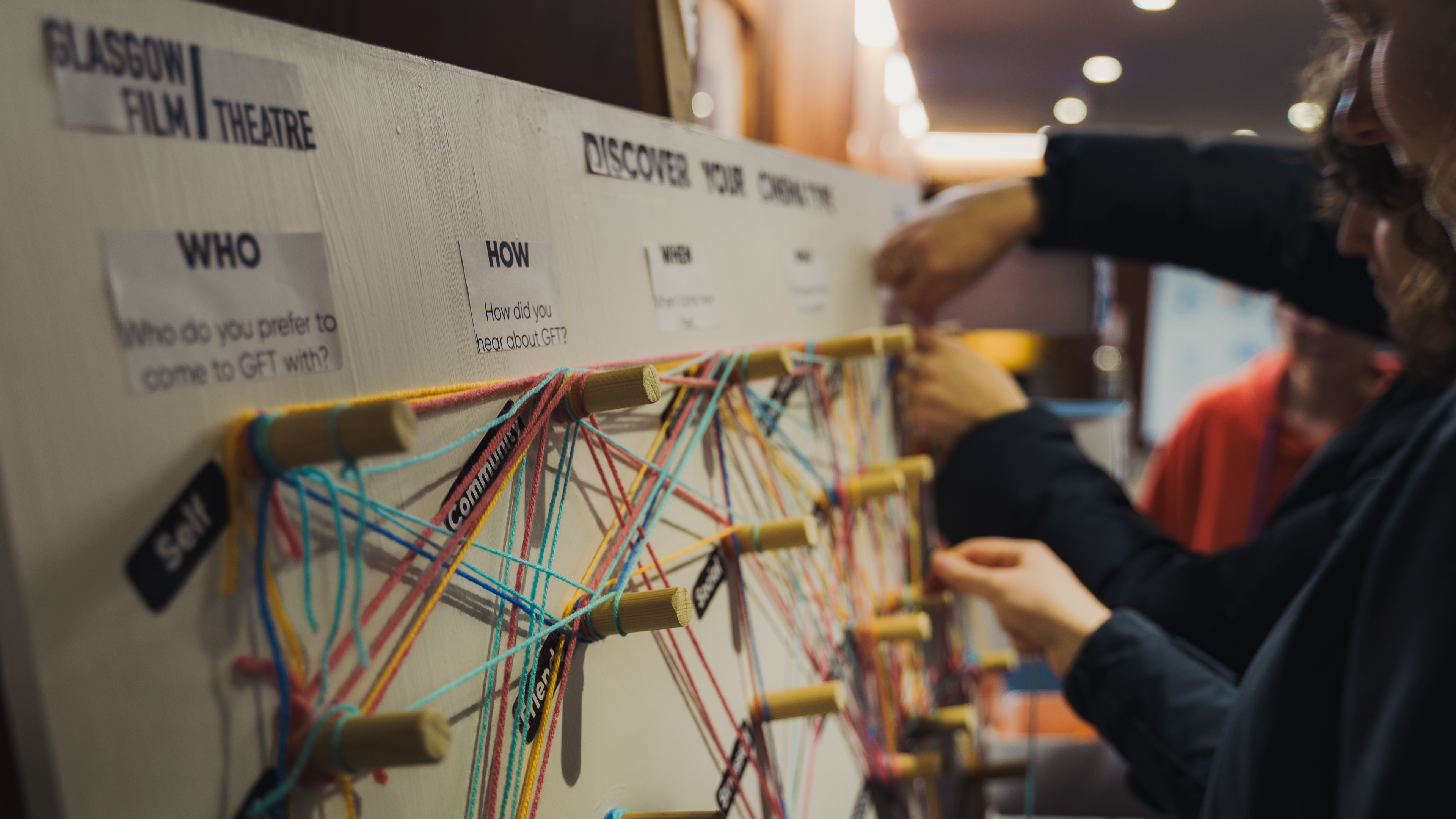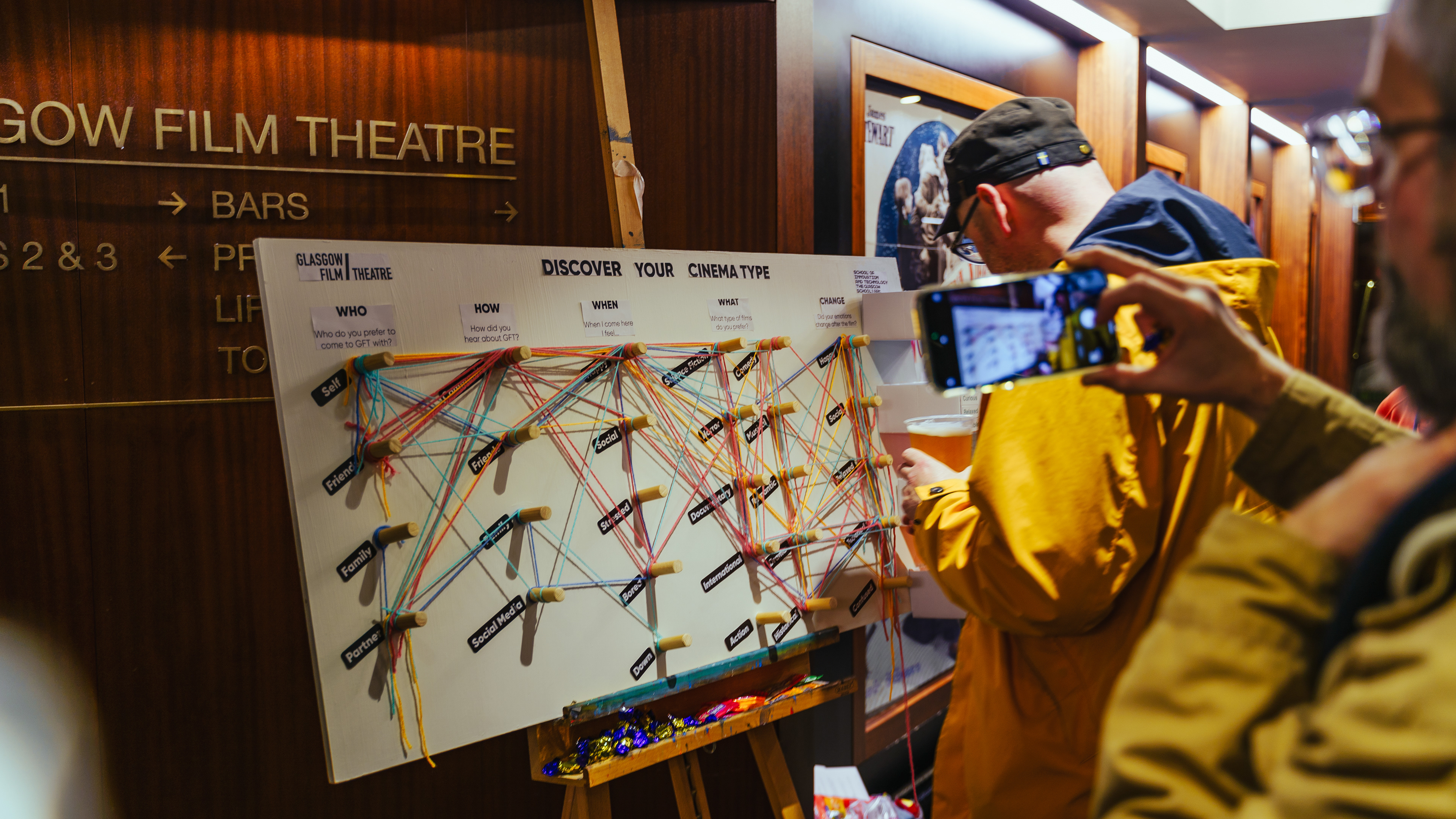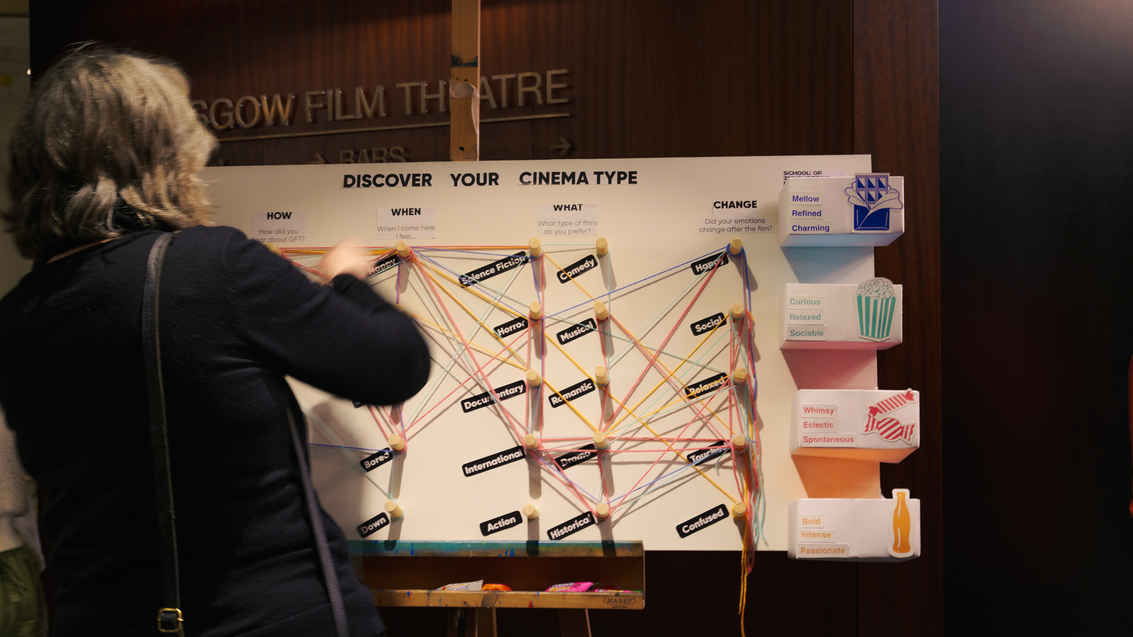 We set up an interactive board in the GFT lobby to invite visitors to share their cinema experiences. Participants chose a 'cinema snack' that matched their personality traits, which determined the colour of yarn they used to trace their cinema journey. Our team was on hand to guide the activity, making it easy for people to take part while creating opportunities for conversation.