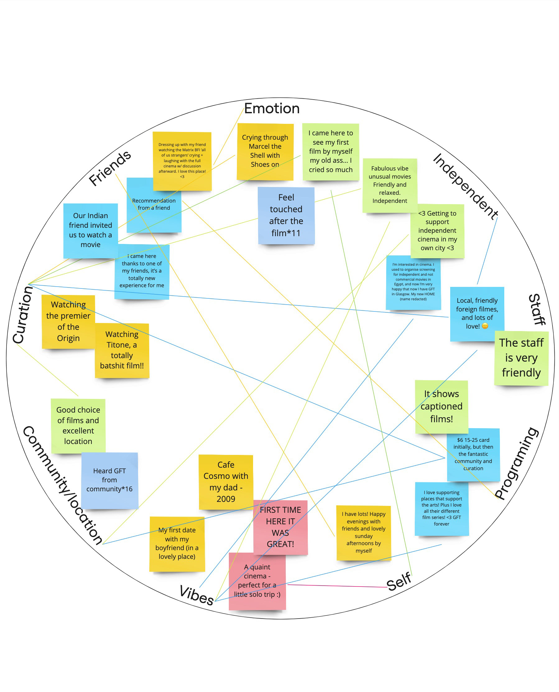 This board asked four questions about connection/experiences at the cinema.This board was maintenance and allowed people to share experiences with the cinema without staffing.