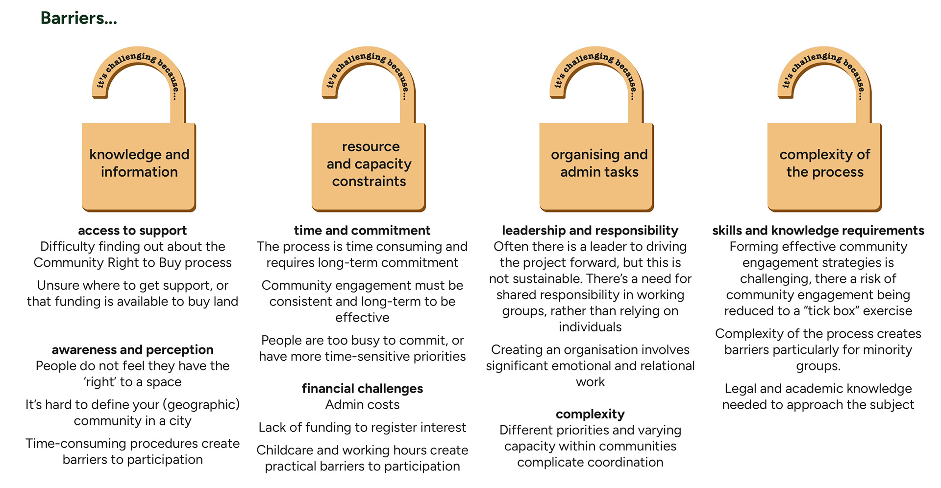 The Community Right to Buy framework was designed for rural communities - it explicitly can't be used to protect spaces from property developers. It's only when a community is losing a space that they need to save it, and once the land has been sold to a private owner, it is nearly always too late.