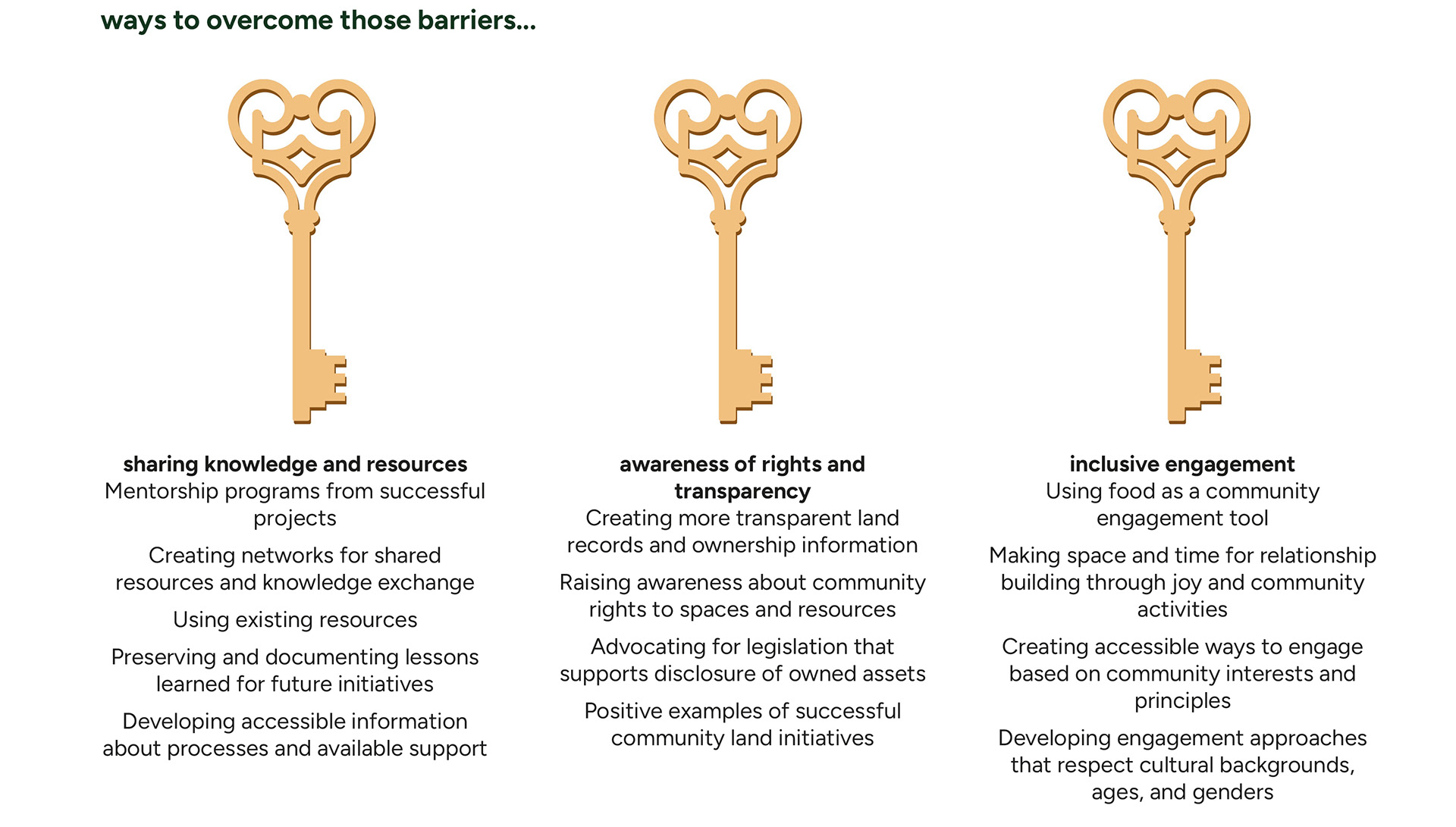 Building trust at the beginning had an impact on the process! I introduced the group to the process through a journey map and storyboard about registering community interest in land. Small teams worked together to identify shared barriers (locks) and ways to overcome them (keys).