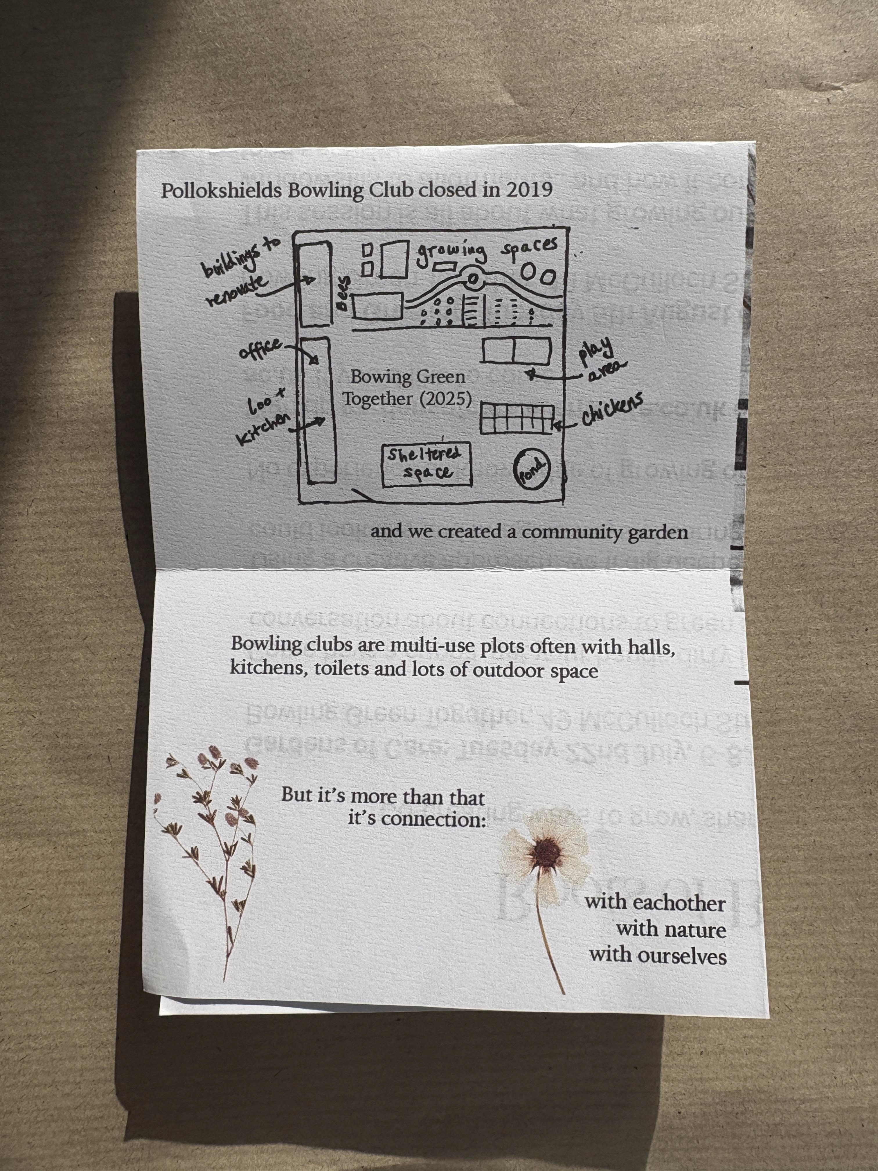 I asked people questions at the zine fair, I also created a low-fi zine to make a complex legal process - community land ownership - more relatable and inclusive. The zine told the story of Bowling Green Together and invited people to participate in garden-based co-creation sessions.